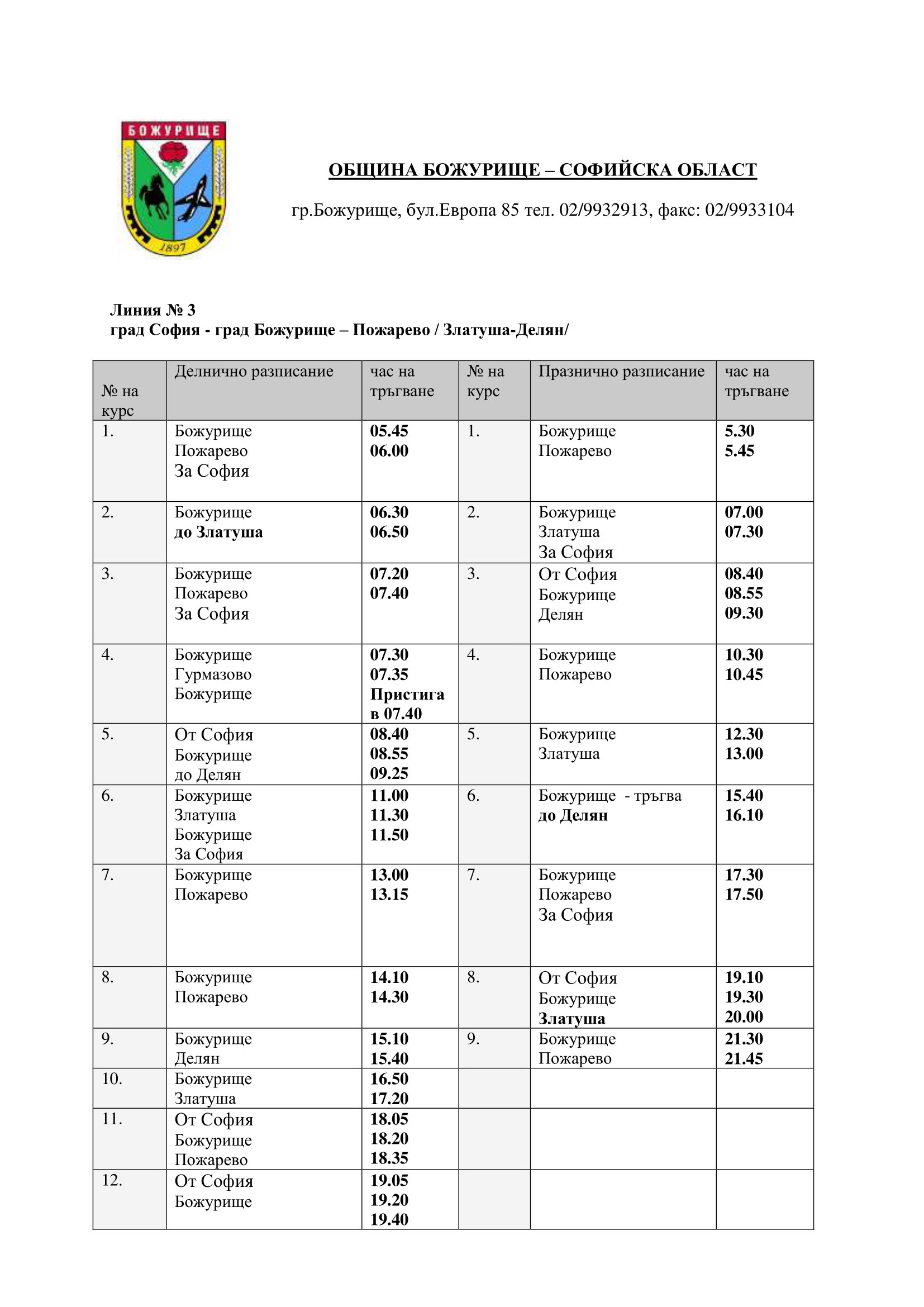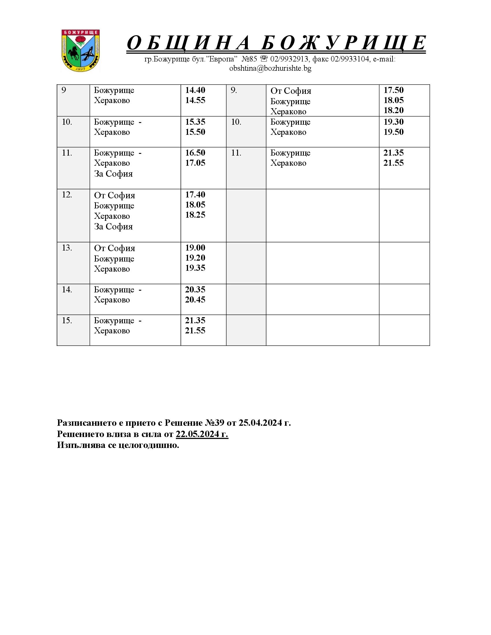 Oт 22.03.2023г. автобусите обслужващи междуселската транспортна схема на община Божурище, ще се движи по следните разписания